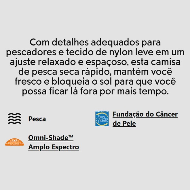 Para quem pratica pesca, essa é uma camisa excepcional. Além da tecnologia de proteção solar, a camisa conta com um suporte para vara de pesca. Ademais, o tecido de poliamida seca rapidamente e há uma abertura para evaporação do suor. É importante, ainda, não deixar de usar protetor solar nas partes do corpo que a camisa Bahama™ II não cobre.