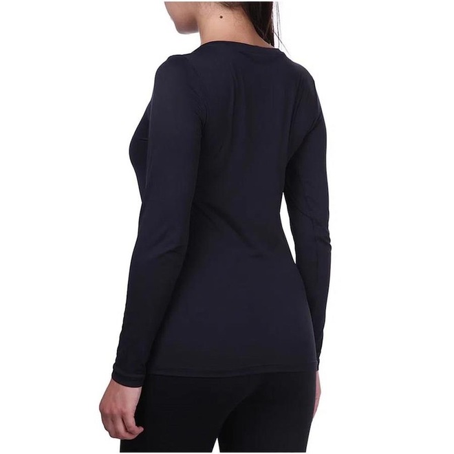 Possui gola careca, mangas longas e seu corte se ajusta ao corpo contribuindo com os movimentos livres.
