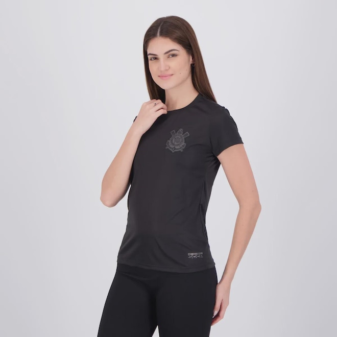 Composição: 100% Poliéster Cor predominante: Preta Time: Corinthians Gênero: Feminino Escudo: Bordado Manga: Curta Gola: Careca Dimensões aproximadas (A x L): P: 62 x 39 cm M: 63 x 42 cm G: 64 x 44 cm GG: 66 x 48 cm EG: 68 x 50 cm
