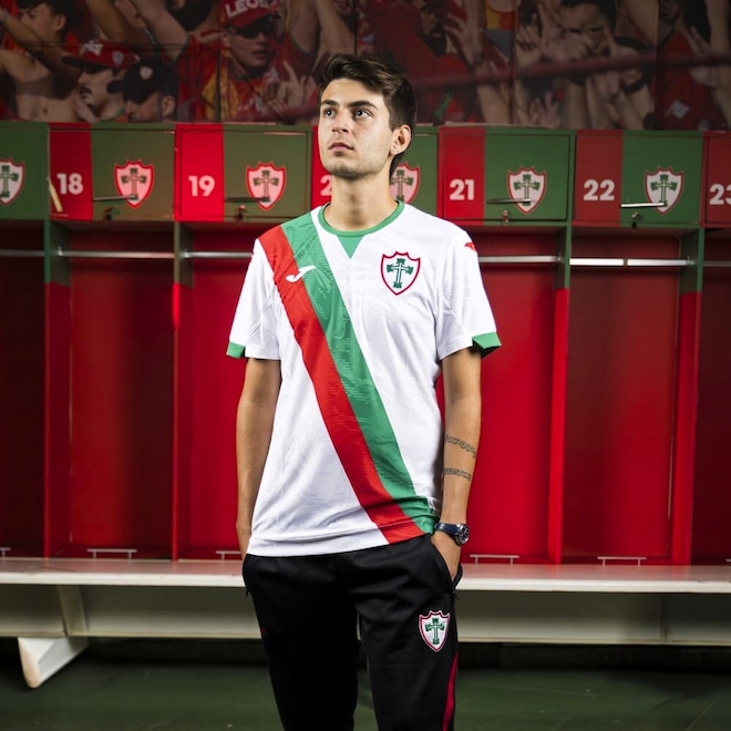 O manto reserva da Lusa produzido pela marca Joma para a temporada 2025 é predominantemente branco e traz faixas na diagonal em verde e vermelho.O escudo da Lusa é bordado e aplicado do lado esquerdo do peito, em sua versão atual padrão, enquanto o logo da JOMA aparece em branco no lado direito.A linha oficial de jogo é confeccionada pela marca Joma , em um projeto exclusivo para a Portuguesa .