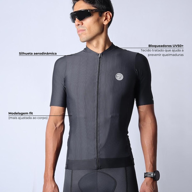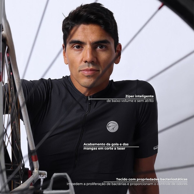 A Camisa Fiber 2.0 Preta foi confeccionada com novo tecido, construído com desenhos lineares e irregulares. Possui toque macio e sedoso, com caimento perfeito e ótima elasticidade. A mistura de poliamida com elastano resiste ao odor ao mesmo tempo que promove a respirabilidade e o fluxo de ar refrescante que percorre no desenho canelado irregular que o tecido possui. Mangas corte a fio e fita italiana termo soldada na frente confere uma estética moderna e sofisticada a peça.
