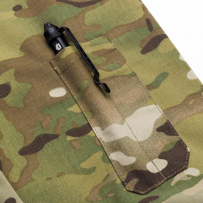 A camisa de combate oferece bolso porta-caneta e abertura para cotoveleiras nas mangas (cotoveleiras vendidas separadamente), além de tecido aderente para a fixação de patches e brasões.