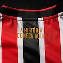 A Camisa do São Paulo 2024 AWAY Torcedor apresenta as clássicas listras verticais e gola V. Na parte de trás do modelo, exibe a marcante inscrição "A História Começa Aqui" e o selo "Made in Cotia: atletas e cidadãos", simbolizando os jovens talentos formados na base do clube.