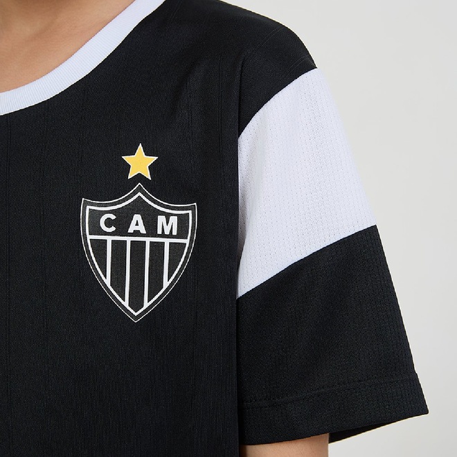 A peça traz o emblemático escudo do Atlético Mineiro estampado com destaque no lado esquerdo do peito, as letras "CAM" e a estrela dourada acima — símbolo de conquistas e orgulho alvinegro.