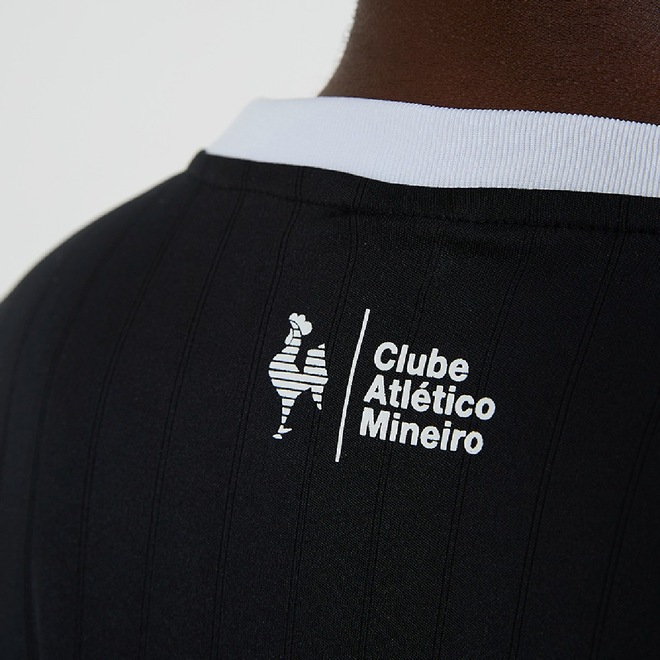 A peça traz o emblemático escudo do Atlético Mineiro estampado com destaque no lado esquerdo do peito, composto pelas tradicionais listras verticais em preto e branco, as letras "CAM" e a estrela dourada acima — símbolo de conquistas e orgulho alvinegro.