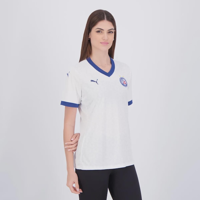 A Puma apresenta a camisa I do Bahia para a temporada 2025, uma homenagem à rica cultura baiana e à força feminina da “Terra Mãe do Brasil”. Com modelagem regular, a peça é branca e traz estampa sublimada inspirada nas rendas dos trajes das baianas. A gola V e os punhos ganham contraste em azul, assim como os logos da Puma. O escudo oficial do clube aparece bordado no peito, e a frase “Bahia, Terra Mãe” reforça a identidade cultural. Confeccionada em poliéster, oferece conforto, respirabilidade e muito estilo ao torcedor.TecnologiaDry Cell: Mantém o suor longe da pele, enquanto os recursos de fluxo de ar anatomicamente colocados oferecem uma superior regulagem de temperatura para manter o corpo seco e fresco durante o uso.Composição: 100% PoliésterClube: BahiaCor predominante: BrancaModelo: TorcedorGênero: FemininoOrigem: NacionalEscudo: BordadoManga: CurtaGola: VDimensões aproximadas (A x L):PP (XS): 64 x 43 cmP (S): 65 x 44 cmM (M): 66 x 46 cmG (L): 67 x 51 cmGG (XL): 70 x 55 cmEG (XXL): 81 x 64 cmEEG (3XL): 83 x 78 cmEEEG (4XL): 85 x 81 cm