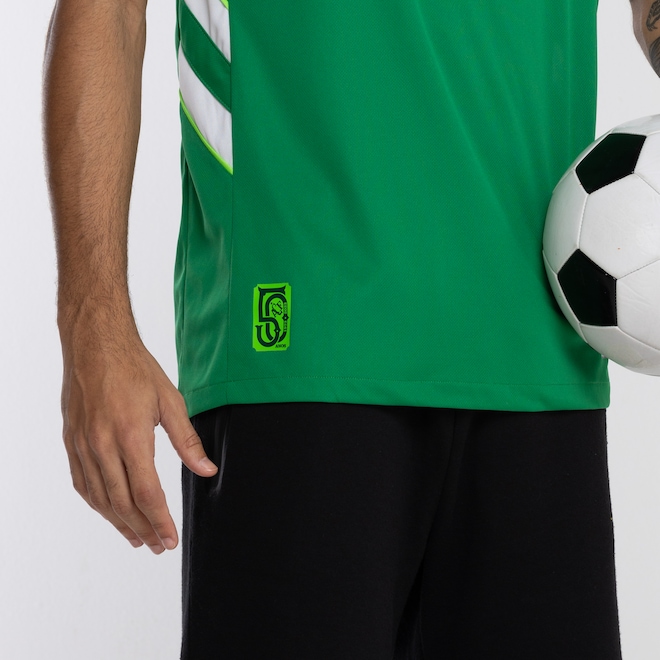 Conta com mangas curtas, sua gola é em “v” com tira interna e o logo é bordado.