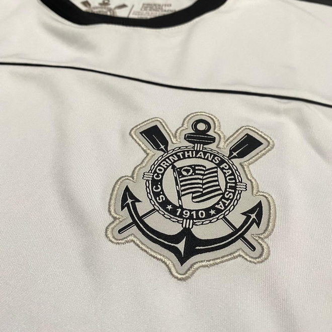 Seu design conta com gola em decote V e mangas curtas, proporcionando conforto e leveza para o dia a dia. O grande destaque fica por conta do escudo do Corinthians bordado no peito, que reforça a identidade do clube com elegância e orgulho. Uma peça pensada para quem vive a paixão pelo Timão com atitude e sofisticação.