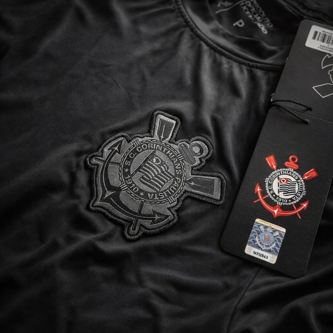O modelo conta com escudo do Corinthians bordado em destaque no peito, trazendo um acabamento sofisticado e durável, além de reforçar a autenticidade e o orgulho alvinegro. A gola redonda com acabamento reforçado proporciona conforto no uso diário, enquanto o design minimalista em preto confere um visual elegante e fácil de combinar. A presença de detalhes discretos na barra agrega ainda mais estilo à peça.