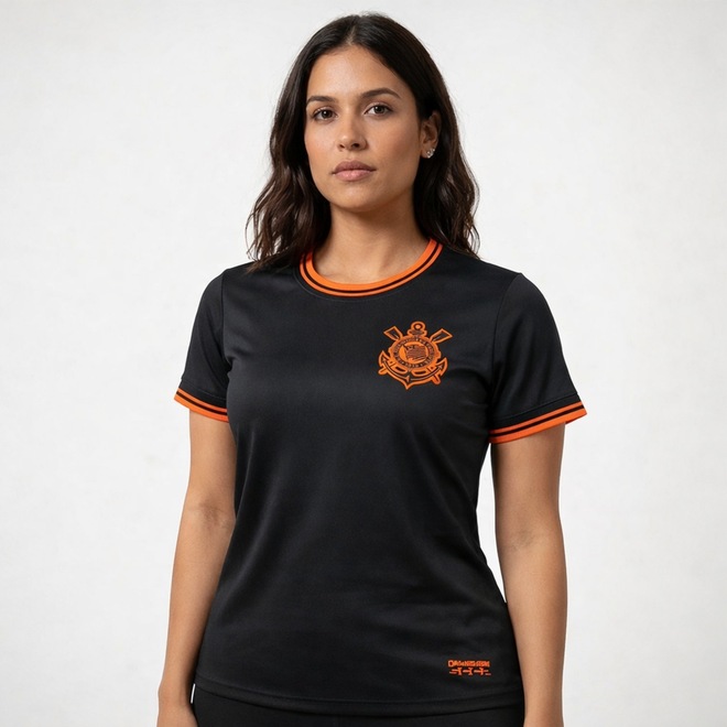 O destaque fica por conta do escudo do Corinthians em TPU aplicado no peito, trazendo um visual moderno, com acabamento em alto relevo e maior durabilidade. O contraste em laranja vibrante adiciona um toque ousado e contemporâneo ao design. A camisa conta com gola redonda com acabamento reforçado, além de detalhes em laranja na gola e nas mangas, que valorizam o visual e garantem um estilo único. A modelagem feminina proporciona um caimento mais ajustado ao corpo, sem abrir mão do conforto.