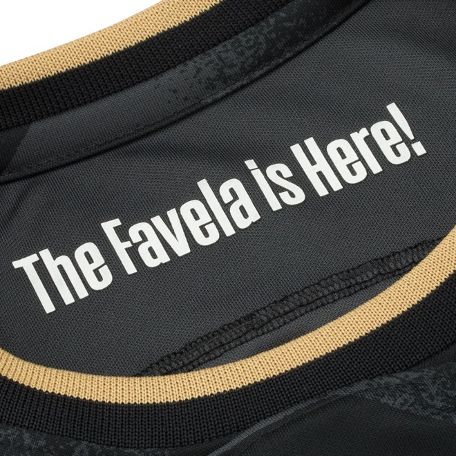 A Camisa do Corinthians Masculina é de mangas curtas, gola careca com tira interna em tecido e na parte interna com a frase “ A favela é aqui”.
