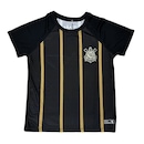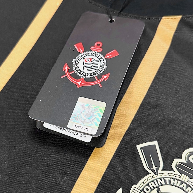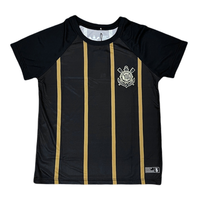 A peça é a tradicional camisa do Corinthians na cor preta com as listras em dourado, produzida em 100% poliéster leve e escudo estampado no peito.