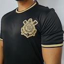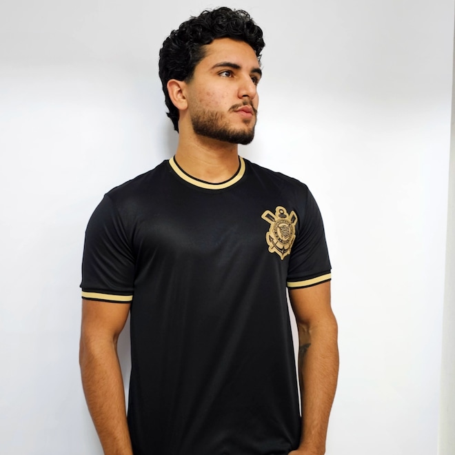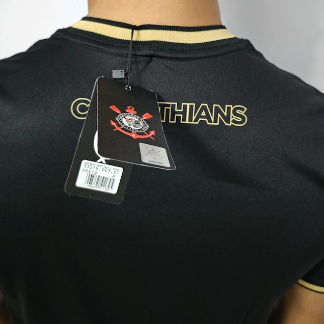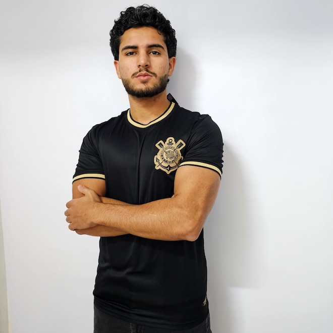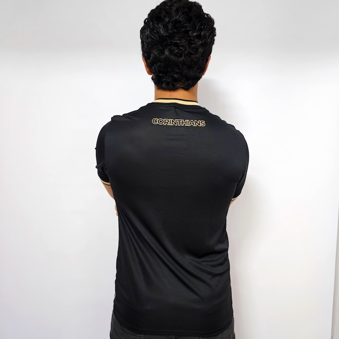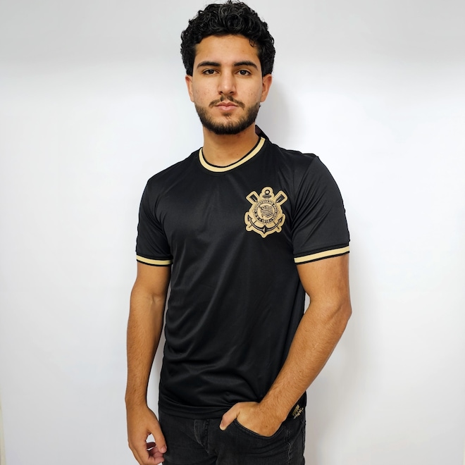 Predominantemente preta, essa peça se destaca pelos detalhes em dourado na gola careca e nas mangas curtas, conferindo um toque de sofisticação ao visual. O grande diferencial fica por conta do escudo bordado, que dá autenticidade e reforça o orgulho corintiano com muito charme.