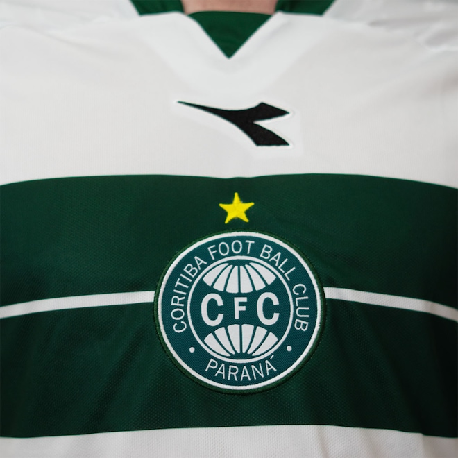 No centro do peito, o escudo do Coritiba aparece bordado com riqueza de detalhes, acompanhado logo acima pelo logo da Diadora, também bordado, reforçando a autenticidade da peça. Com acabamento sutil e refinado, esta camisa é perfeita para o torcedor que deseja vestir sua paixão com orgulho e estilo.