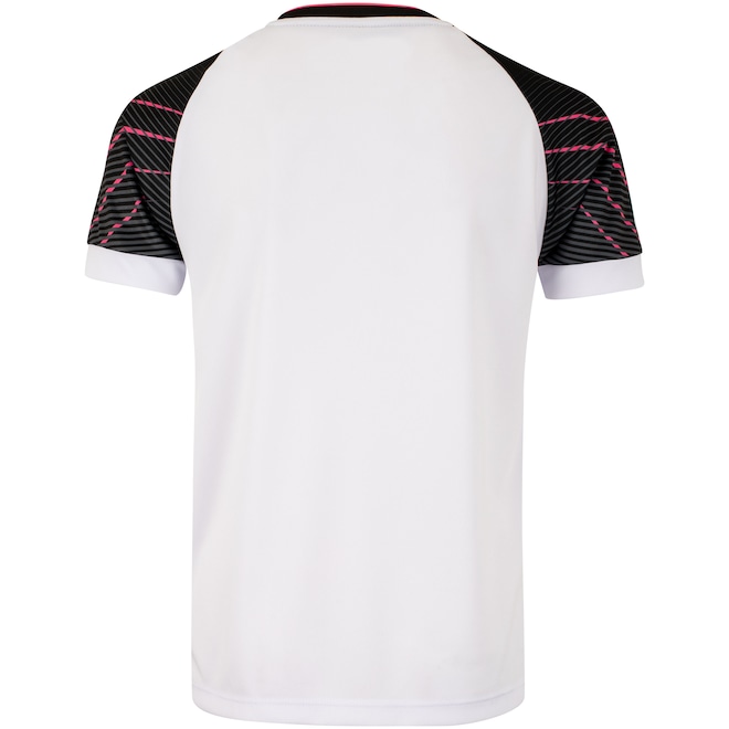 A camisa do Falcão juvenil é de mangas curtas, com gola em “v” e tira interna em tecido que ajuda a diminuir o atrito de contato com a costura.