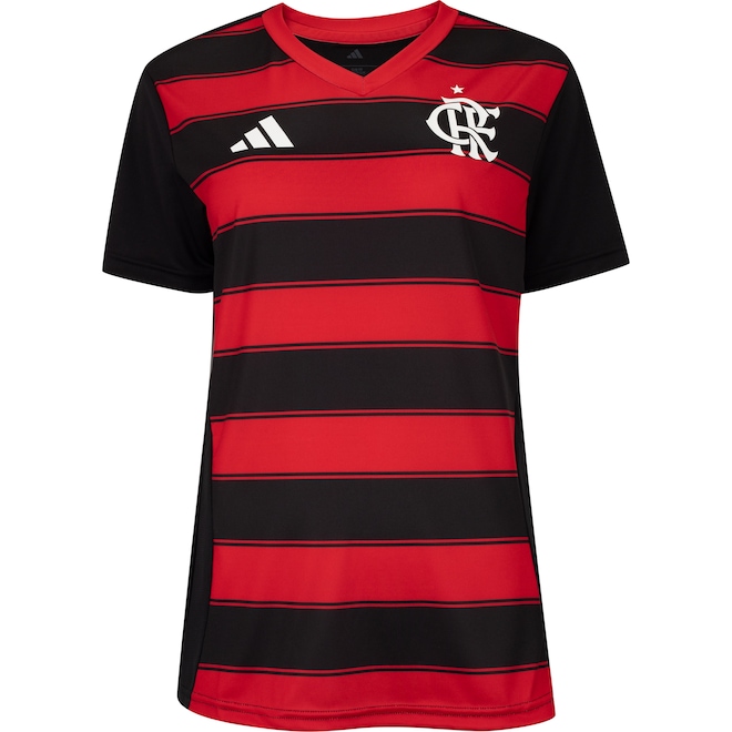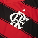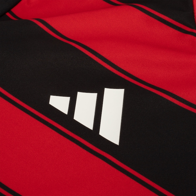 O escudo do clube no peito e as clássicas listras traduzem tradição e orgulho rubro-negro.
