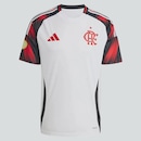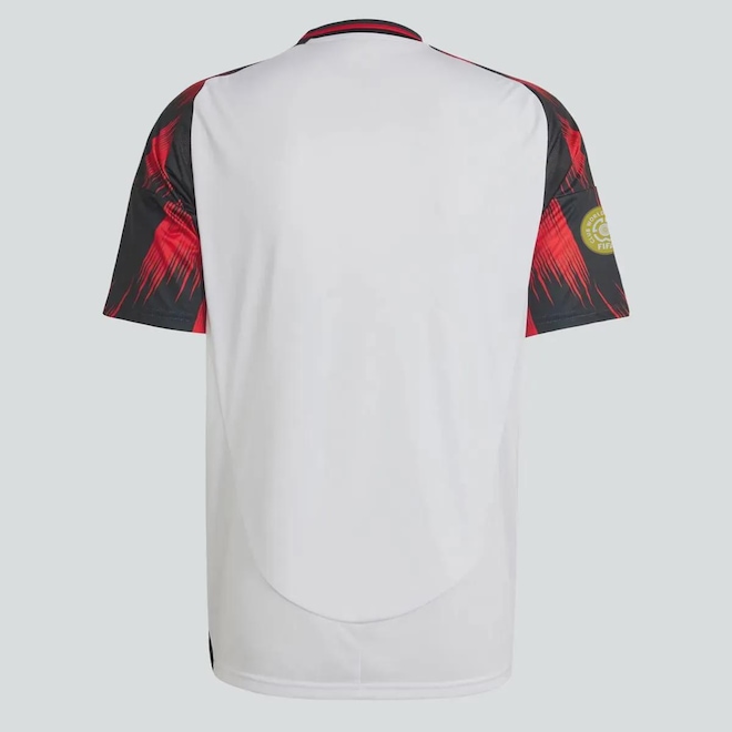 A camisa II do Flamengo 2025, assinada pela Adidas, é uma homenagem marcante ao mascote Urubu. Com design branco, destaca-se pelas mangas pretas com grafismos vermelhos que remetem às penas da ave, símbolo de raça e tradição rubro-negra. Produzida em poliéster leve com tecnologia AEROREADY, garante respirabilidade e conforto. A gola é careca com detalhes em branco, preto e vermelho, enquanto o escudo bordado e o logo em vermelho reforçam o orgulho pelo clube. As costas são totalmente brancas, completando um visual ousado e cheio de identidade.