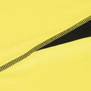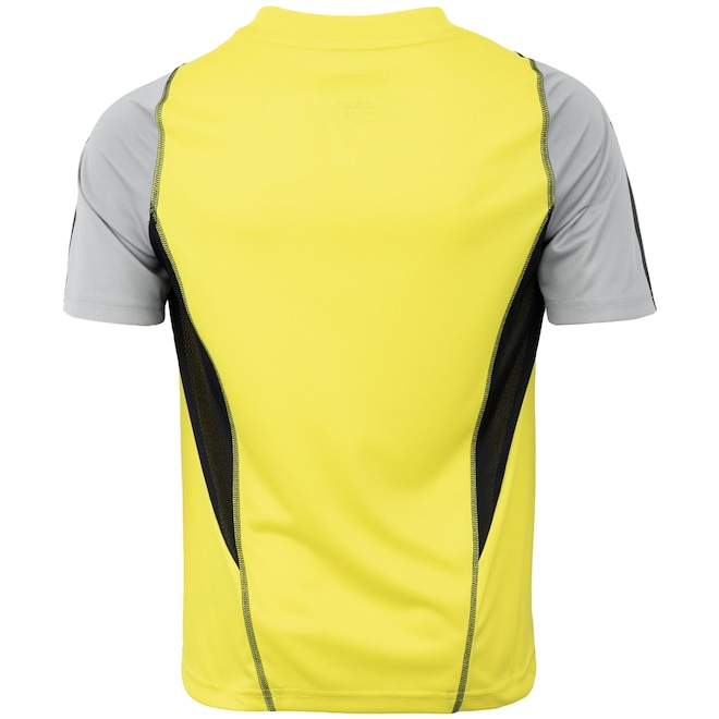 Já suas mangas são curtas e tem gola em “v”, canelada e com tira interna.