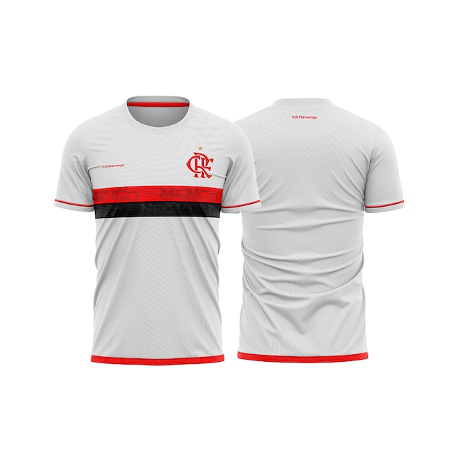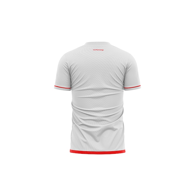 Produzida em 100% poliéster leve e respirável, a peça conta com um design ousado e moderno, na cor branca e com a faixa rubro negra na parte central, além do escudo do Mengão do lado esquerdo do peito.
