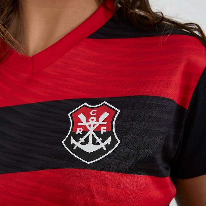 Cropped feminino confeccionado em tecido de poliéster leve e confortável, ideal para mostrar seu amor pelo Mengão com estilo. Possui listras horizontais em vermelho e preto na parte frontal, com o escudo oficial do Flamengo estampado no lado esquerdo do peito, trazendo destaque e autenticidade à peça.