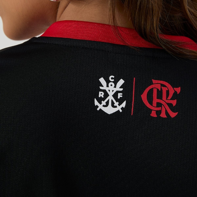 As costas são totalmente pretas, criando um contraste moderno e versátil. O modelo tem caimento ajustado e é perfeito para compor looks casuais ou esportivos com atitude rubro-negra.