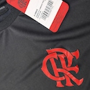 O modelo conta com escudo do Flamengo estampado no peito, oferecendo um visual moderno e minimalista, com destaque para o contraste em vermelho sobre o fundo preto. A camisa possui gola redonda com acabamento reforçado, que proporciona melhor ajuste e durabilidade. O design é complementado pelo detalhe “NAÇÃO” próximo à barra, reforçando a identidade e a paixão da torcida rubro-negra.