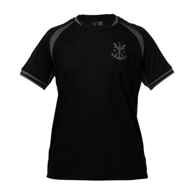 A camisa do Flamengo apresenta um estilo moderno e versátil, com predominância na cor preta que transmite sofisticação e casualidade. Os símbolos do clube aparecem em destaque ao longo da peça, reforçando a identidade rubro-negra com elegância.