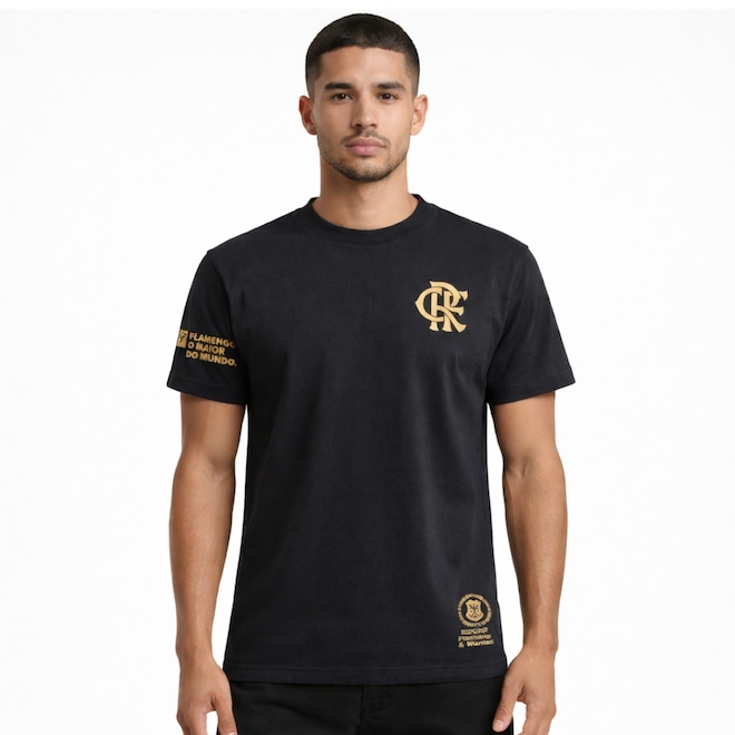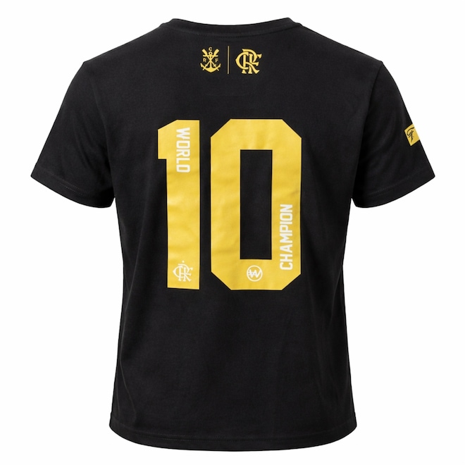 Na parte frontal, o destaque fica para o escudo do Flamengo estampado no peito, símbolo de paixão e grandeza do clube. Os detalhes em dourado trazem um visual sofisticado que valoriza ainda mais a identidade rubro-negra. Nas costas, o grande destaque é o número 10 estampado, acompanhado da inscrição World Champion, celebrando a histórica conquista mundial que eternizou o Flamengo no cenário do futebol internacional. Com gola redonda tradicional, a peça garante conforto e versatilidade, sendo ideal para compor looks casuais ou demonstrar sua paixão pelo Mengão em qualquer ocasião.