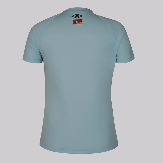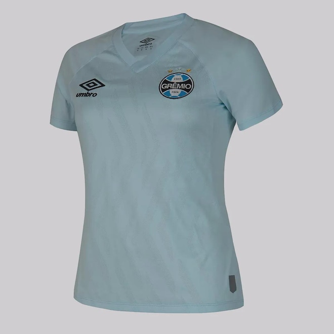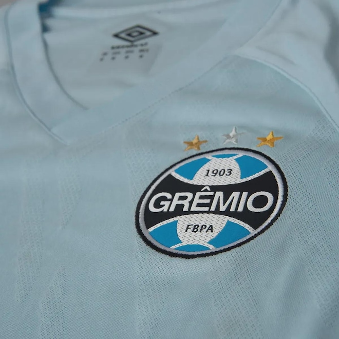 A Camisa Umbro Grêmio II 2025 Feminina celebra a força da torcedora gremista com um visual clássico e marcante. Predominantemente azul celeste, a peça une tradição e inovação com grafismos sutis, gola V texturizada, escudo bordado e bandeira do RS na nuca. Com modelagem fit, frente em jacquard e costas em mesh respirável, oferece conforto e estilo para viver o Imortal todos os dias.