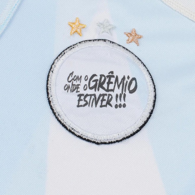 - Escudo bordado premium com estampa interna “Com o Grêmio onde o Grêmio estiver”, reforçando a conexão com o clube;