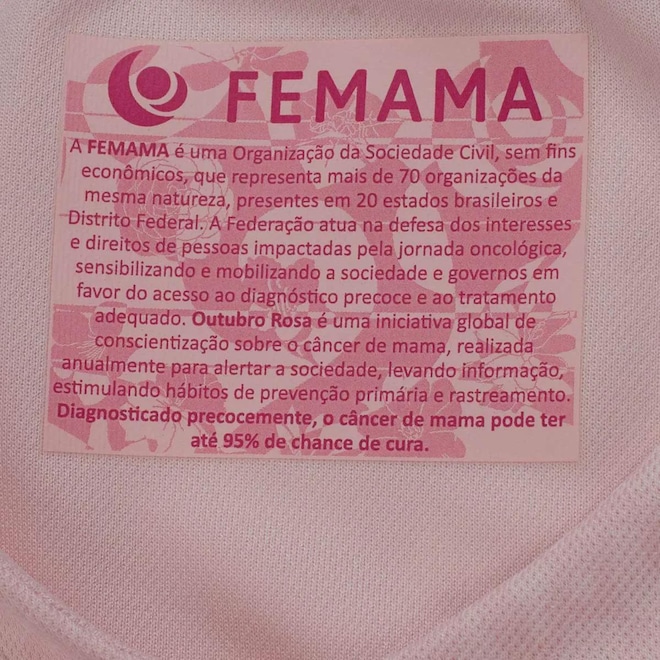 A Umbro se une à FEMAMA (Federação Brasileira de Instituições Filantrópicas de Apoio à Saúde da Mama) em uma parceria que vai além do esporte. Juntas, promovem a conscientização sobre a importância da prevenção e do diagnóstico precoce do câncer de mama. Cada peça da coleção especial celebra a força, a coragem e a união na luta contra a doença, incentivando mulheres de todo o Brasil a cuidarem da própria saúde. Com estilo e propósito, vestir Umbro agora também é um gesto de apoio à causa. Composição: 100% Poliéster Cor predominante: Rosa Indicado para: Casual Gênero: Feminino Origem: Nacional Escudo: Emborrachado Clube: Grêmio Manga: Curta Gola: V Dimensões aproximadas (A x L): P: 60 x 45 cm M: 63 x 47 cm G: 64 x 51 cm GG: 65 x 54 cm EG (2GG): 68 x 56 cm