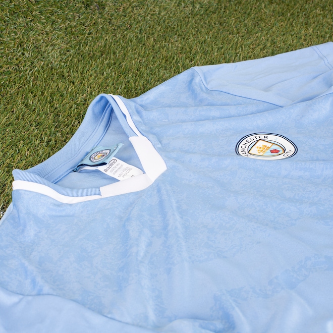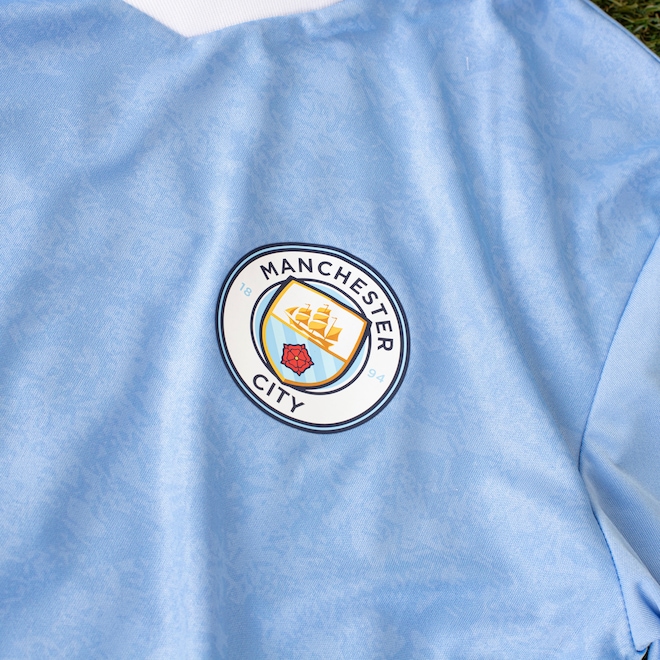 A estampa personalizada celebra o Manchester City, elevando o espírito dos Sky Blues.