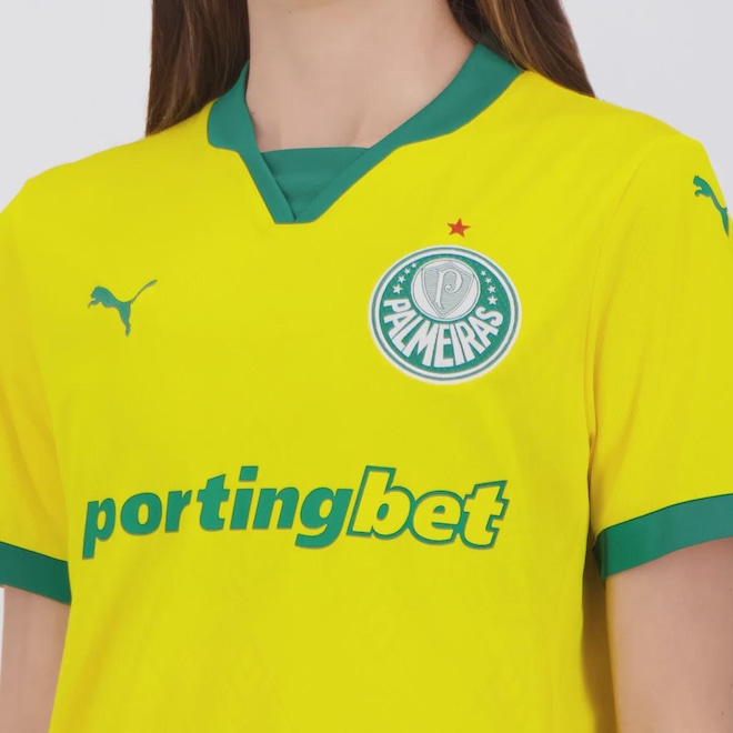 “Palmeiras, Meu Palmeiras” Desenvolvido pela Puma, o manto III do Palmeiras para 2025, traz como inspiração as cores utilizadas pelo clube no amistoso contra o Uruguai em 1965, quando o Palestra representou a Seleção Brasileira. Com homenagem às cores da Seleção Brasileira, o manto exibe cores que mexem com o sentimento dos palestrinos: amarelo vibrante com detalhes em verde. O destaque do uniforme fica por conta de embossing frontal que remete ao título de “Maior Campeão do Brasil”, trazendo losangos junto a um escudo alternativo com o “P” envolto em louros, reforçando a tradição do Verdão. TecnologiaDry Cell: Mantém o suor longe da pele, enquanto os recursos de fluxo de ar anatomicamente colocados oferecem uma superior regulagem de temperatura para manter o corpo seco e fresco durante o uso.Composição: 100% PoliésterCor predominante: AmarelaModelo: TorcedorGênero: FemininoOrigem: NacionalClube: PalmeirasEscudo: BordadoManga: CurtaGola: VDimensões aproximadas (A x L):PP (XS): 64 x 43 cmP (S): 65 x 45 cmM (M): 67 x 48 cmG (L): 68 x 52 cmGG (XL): 70 x 61 cmEG (XXL): 72 x 63 cmEEG (3XL): 74 x 65 cmEEEG (4XL): 76 x 67 cm