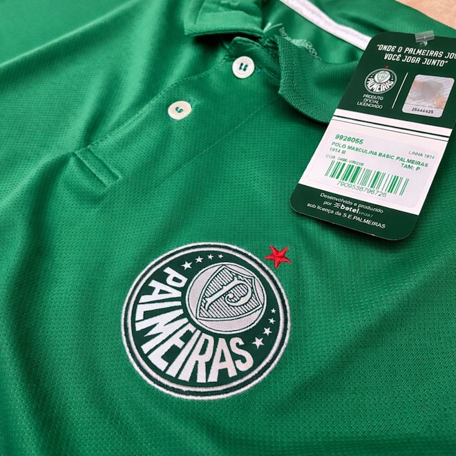 O modelo conta com escudo do Palmeiras bordado no peito, trazendo um visual premium e maior resistência ao desgaste. A tradicional gola polo estruturada adiciona sofisticação ao design, enquanto o fechamento conta com botões personalizados com a escrita “Palmeiras”, reforçando a identidade do clube. Outro destaque é o detalhe discreto próximo à barra com a inscrição “1914”, representando o ano de fundação do clube e agregando ainda mais valor histórico à peça.