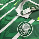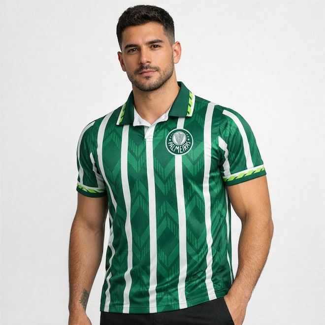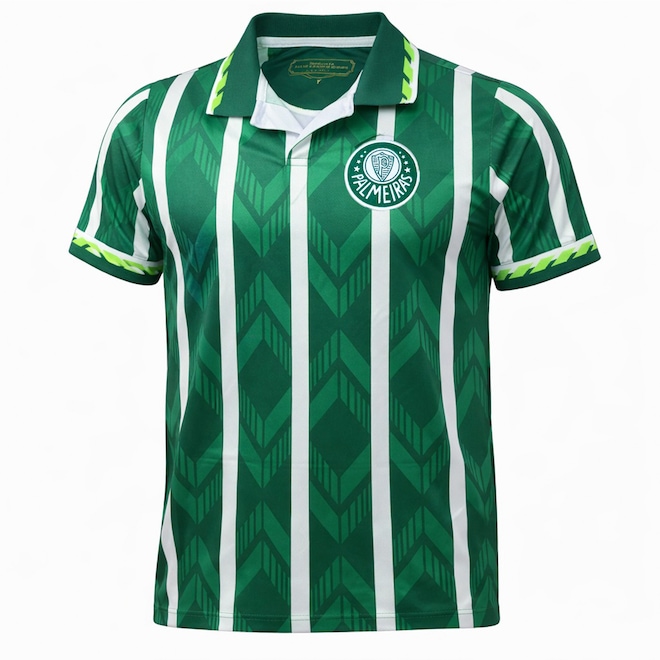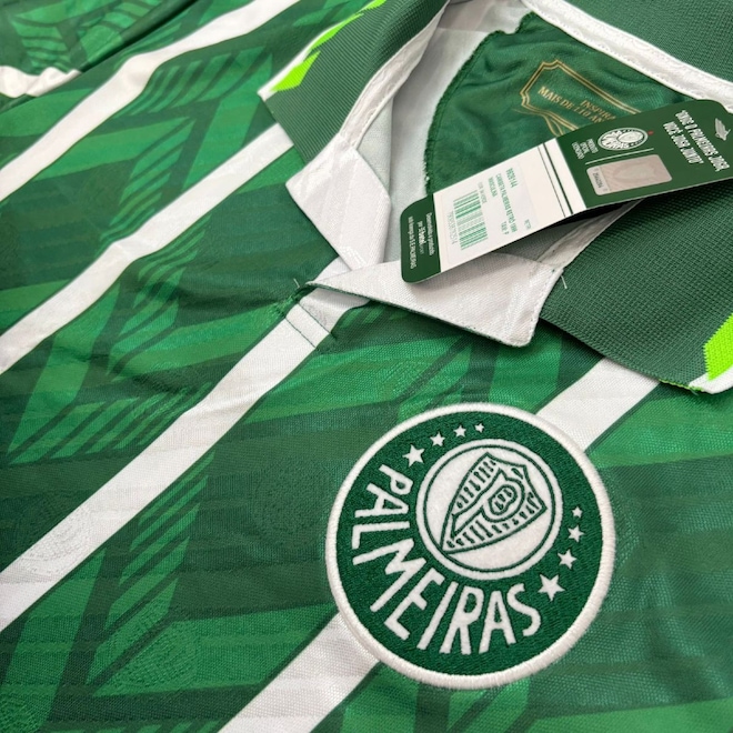 O modelo traz o escudo do Palmeiras bordado no peito, proporcionando um acabamento premium e destacando a grandeza do clube. Seu design com listras verticais e grafismos modernos valoriza o visual, trazendo um equilíbrio perfeito entre o retrô e o contemporâneo. A peça conta com gola polo estruturada, que adiciona um toque sofisticado ao look, além de detalhes exclusivos nas mangas, que reforçam o estilo esportivo e diferenciado da camisa.