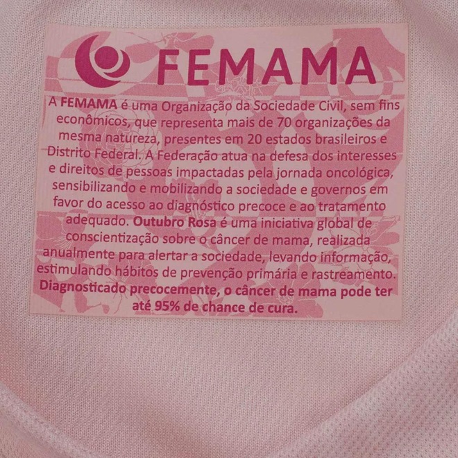 A Umbro se une à FEMAMA (Federação Brasileira de Instituições Filantrópicas de Apoio à Saúde da Mama) em uma parceria que vai além do esporte. Juntas, promovem a conscientização sobre a importância da prevenção e do diagnóstico precoce do câncer de mama. Cada peça da coleção especial celebra a força, a coragem e a união na luta contra a doença, incentivando mulheres de todo o Brasil a cuidarem da própria saúde. Com estilo e propósito, vestir Umbro agora também é um gesto de apoio à causa. Composição: 100% Poliéster Cor predominante: Rosa Indicado para: Casual Gênero: Feminino Origem: Nacional Escudo: Emborrachado Clube: Santos Manga: Curta Gola: V Dimensões aproximadas (A x L): P: 65 x 45 cm M: 66 x 49 cm G: 66 x 52 cm GG: 67 x 53 cm