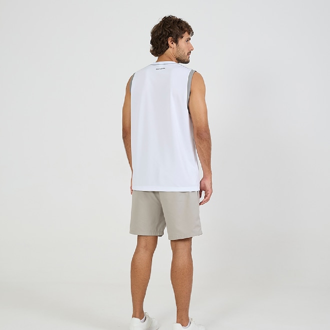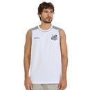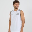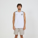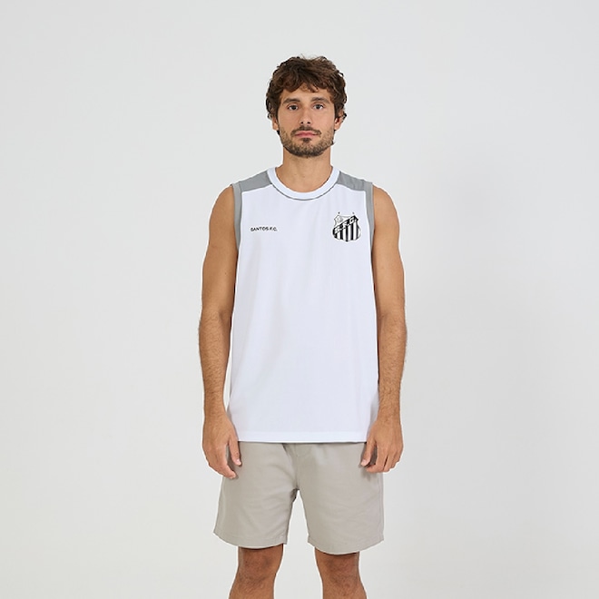 Regata Santos branca confeccionada em tecido poliéster, leve, respirável e ideal para dias quentes ou para acompanhar o Peixe com estilo.