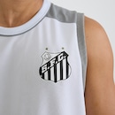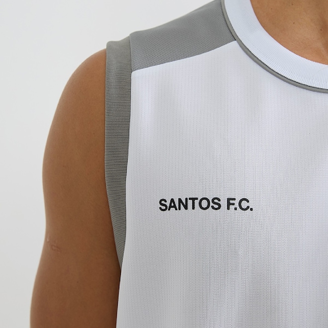 O modelo apresenta detalhes em cinza nas alças e na gola, adicionando um toque moderno ao visual. No lado esquerdo do peito, o nome “SANTOS F.C.” é estampado em preto, enquanto no lado direito está o escudo oficial do Santos Futebol Clube, também em preto, reforçando a identidade alvinegra.
