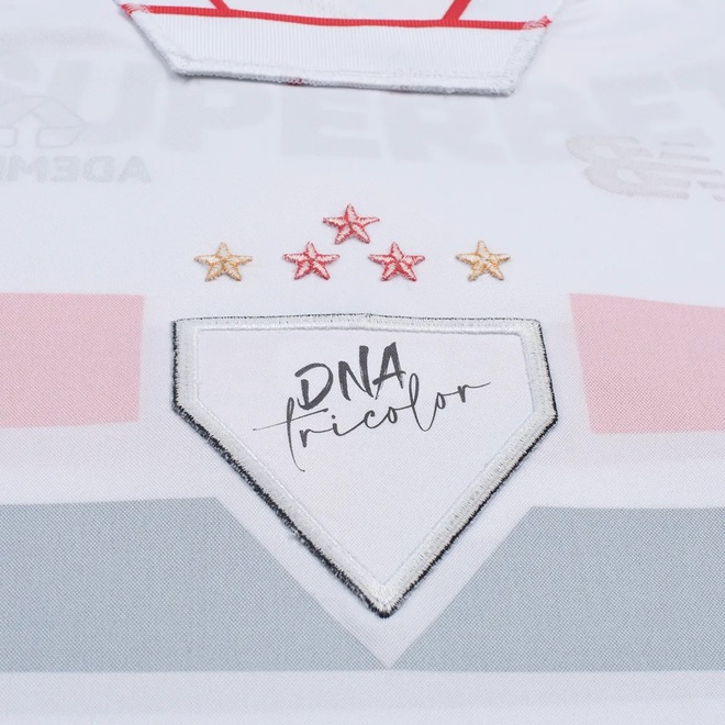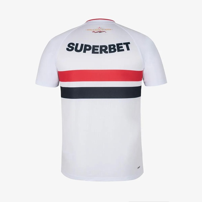 A gola reta com bordas vermelhas adiciona um acabamento premium, enquanto as laterais recebem detalhes tricolores que reforçam a identidade histórica do time. Na parte inferior, um selo comemorativo celebra os 96 anos do clube, transformando a camisa em um item especial para colecionadores e torcedores apaixonados. Na nuca, a frase “Dentre os grandes, és o primeiro”, acompanhada das cinco estrelas e da bandeira estilizada, simboliza orgulho, tradição e a grandeza do Tricolor Paulista.