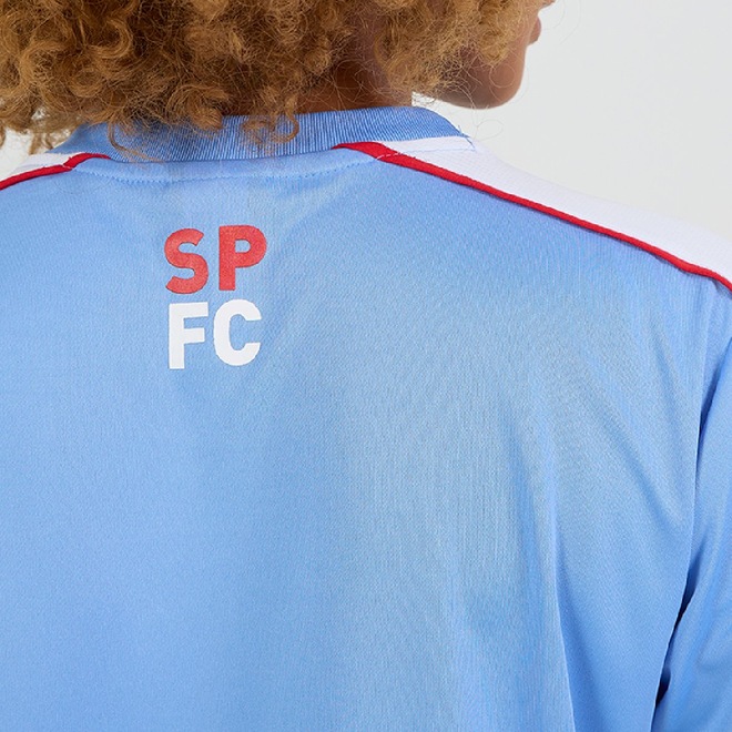 peito, inserido em um padrão em forma de chevron com faixas nas cores preto, vermelho e branco, que representam a alma tricolor do clube. O fundo da peça é azul claro, criando um contraste moderno e elegante com as mangas brancas.