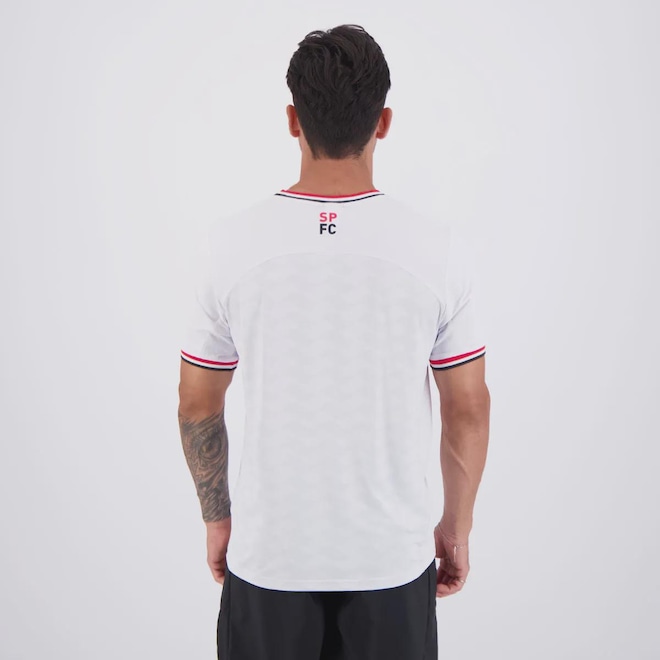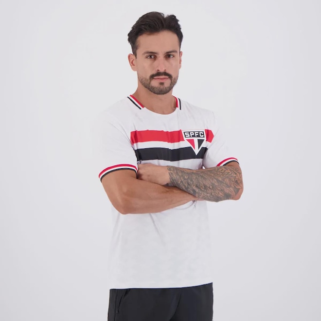 Composição: 100% PoliésterCor predominante: BrancaIndicada para: CasualGênero: MasculinoOrigem: NacionalEscudo: EstampadoClube: São PauloManga: CurtaGola: CarecaDimensões aproximadas (A x L):P: 69 x 50 cmM: 71 x 52 cmG: 73 x 54 cmGG: 75 x 56 cmEG: 77 x 58 cm