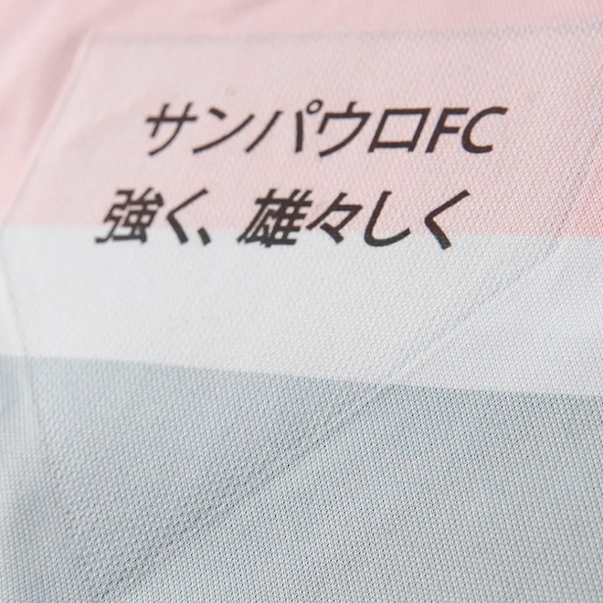Frase em japonês dentro do escudo: “São Paulo FC / Tu és forte, tu és grande”