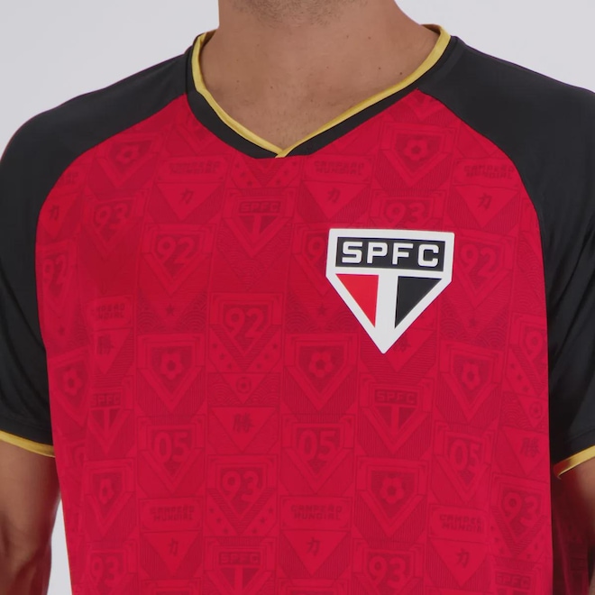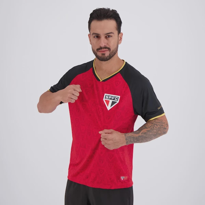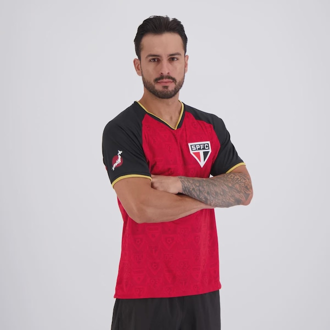 Composição: 100% Poliéster Cor predominante: Vermelha Indicada para: Casual Escudo: Emborrachado Gênero: Masculino Origem: Nacional Time: São Paulo Manga: Curta Gola: V Dimensões aproximadas (A x L): P: 70 x 55 cm M: 71 x 59 cm G: 75 x 60 cm GG: 76 x 63 cm