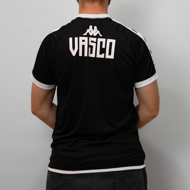 A camisa do Vasco produzida pela Kappa traz o preto como cor predominante, com detalhes em branco que reforçam o contraste elegante e tradicional do clube.