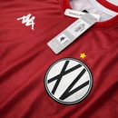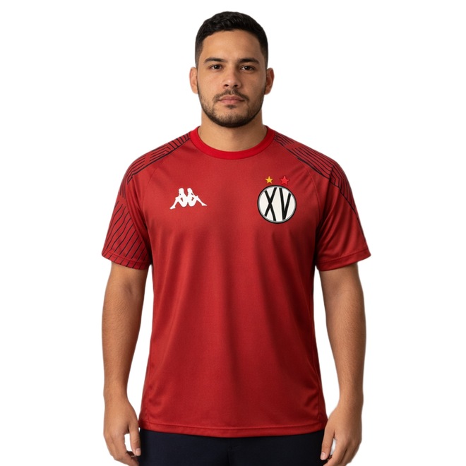 O modelo apresenta o escudo do XV de Piracicaba estampado no peito, destacando a identidade e a tradição do clube com um acabamento moderno e durável. Ao lado, o logo da Kappa complementa o visual esportivo da peça. A camisa possui gola redonda com acabamento reforçado, garantindo um caimento confortável e um visual clássico. Outro destaque são os detalhes gráficos nas mangas, que adicionam um toque moderno ao design e valorizam o estilo esportivo da peça.