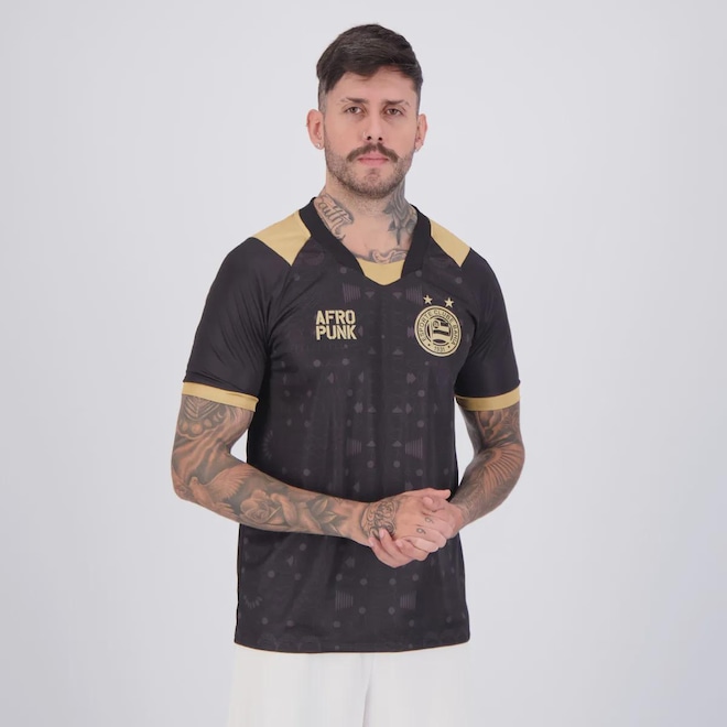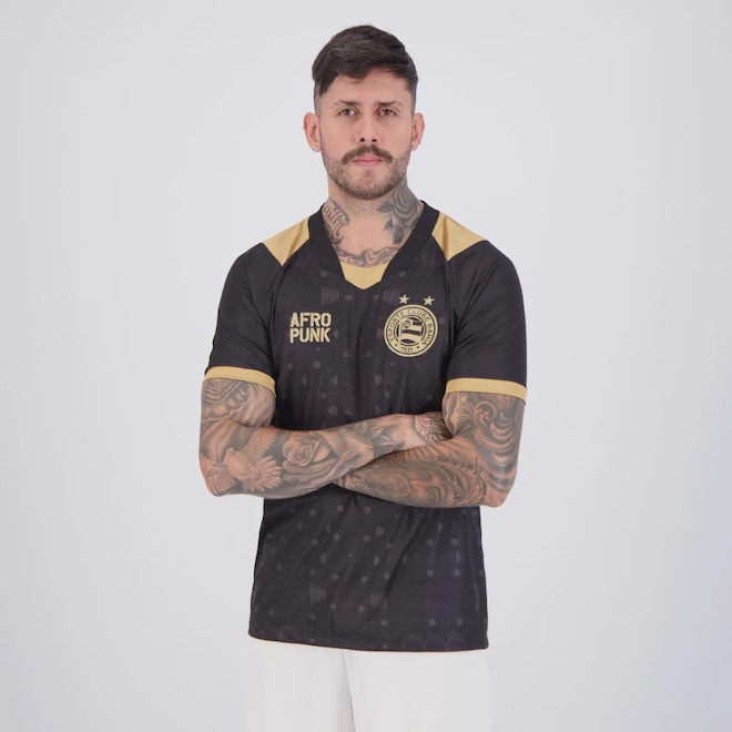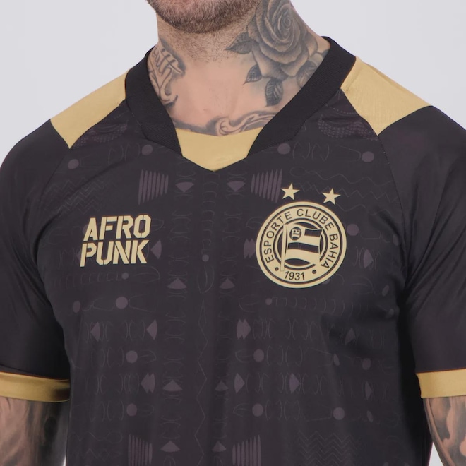 Composição: 100% PoliésterCor predominante: PretaModelo: TorcedorGênero: MasculinoOrigem: NacionalEscudo: EstampadoManga: CurtaClube: BahiaGola: VDimensões aproximadas (A x L):P: 74 x 51 cmM: 76 x 53 cmG: 78 x 55 cmGG: 80 x 57 cmEG (3G): 82 x 59 cm