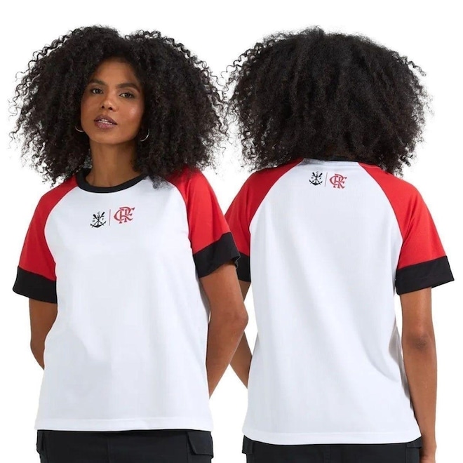 O destaque fica por conta da estampa exclusiva do escudo do Flamengo em destaque no peito e o nome do clube estampado de forma discreta e elegante, reforçando o orgulho de ser torcedora. A peça é perfeita para compor looks casuais com jeans, shorts ou leggings, mantendo o visual esportivo com personalidade.- Modelagem feminina ajustada