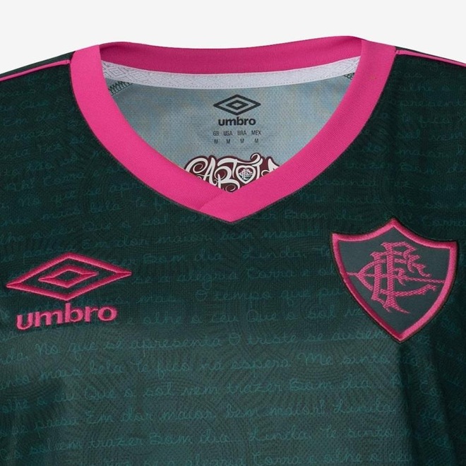 Eu sou é tricolor! A Camisa do Fluminense Feminina 3 2023 traz grafismo por todo design da camisa com manuscrito da letra da canção ?Corra e Olhe o Céu?, escrita e interda pelo ilustre torcedor, o cantor e compositor Cartola. Com modelagem morcego é produzida 100% poliéster e gola V.ref: M1418G