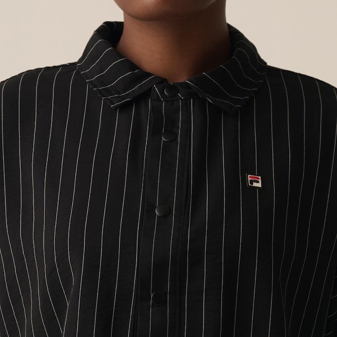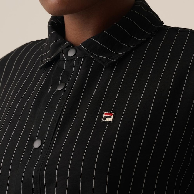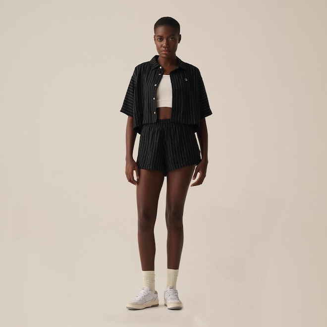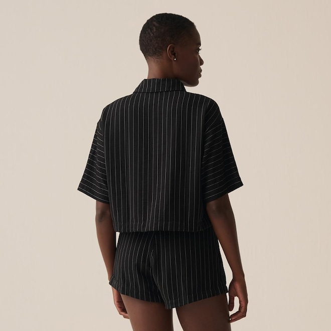 Camisa cropped feminina confeccionada em tecido plano risca de giz em viscose, com toque suave. Modelagem comfort, mais solta no corpo, com gola polo e manga curta. Possui abertura frontal com 5 botões de pressão e patch F-Box bordado na parte frontal esquerda superior.
