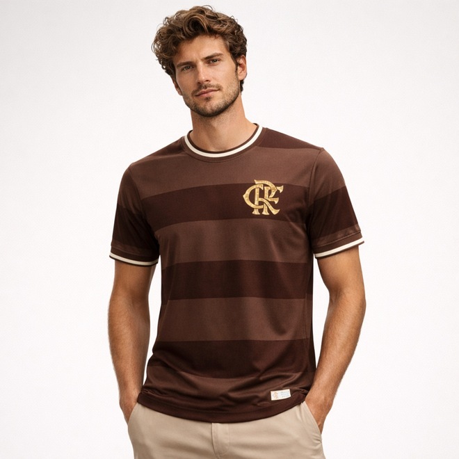 A camisa Flamengo em jacquard com listras marrons é a união perfeita entre tradição e sofisticação.